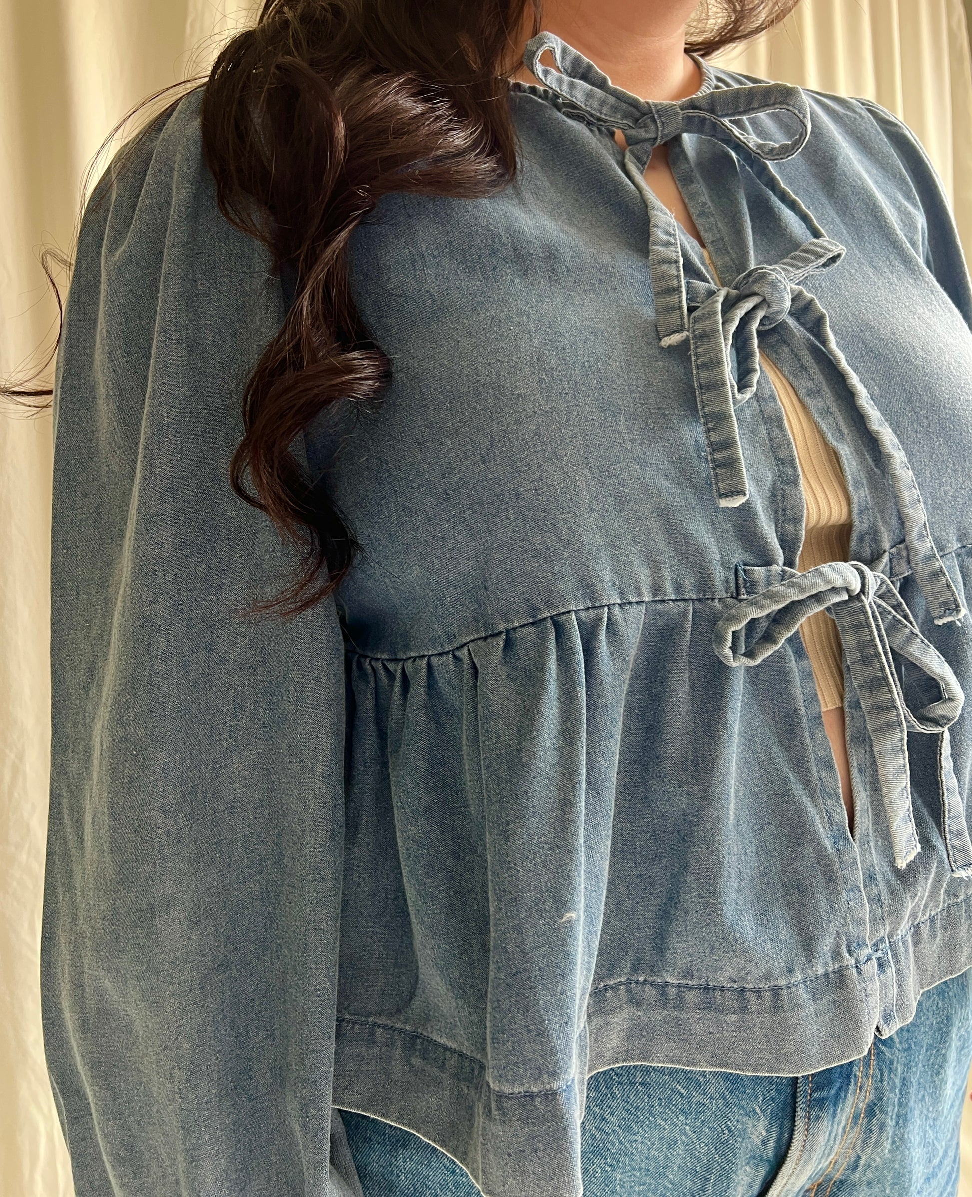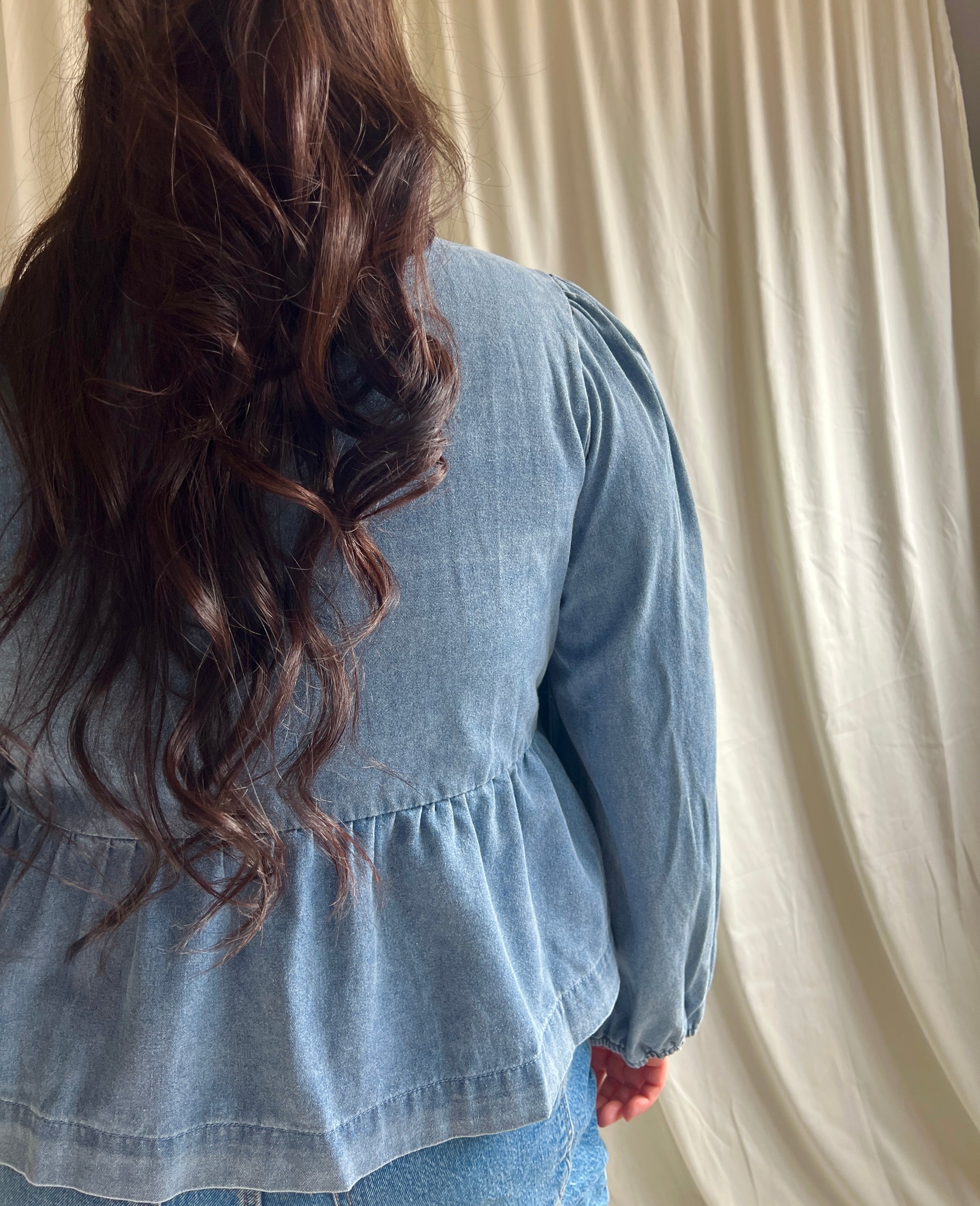 A chic twist on classic denim, this lightweight peplum blouse is perfect for effortless, everyday style. Featuring delicate tie-front closures, puffed long sleeves with elastic cuffs, and a flattering cinched waist, this top blends femininity with a relaxed, vintage-inspired vibe. Pair it with your favorite denim shorts for a breezy, casual look or layer it over a fitted tank for versatile styling.